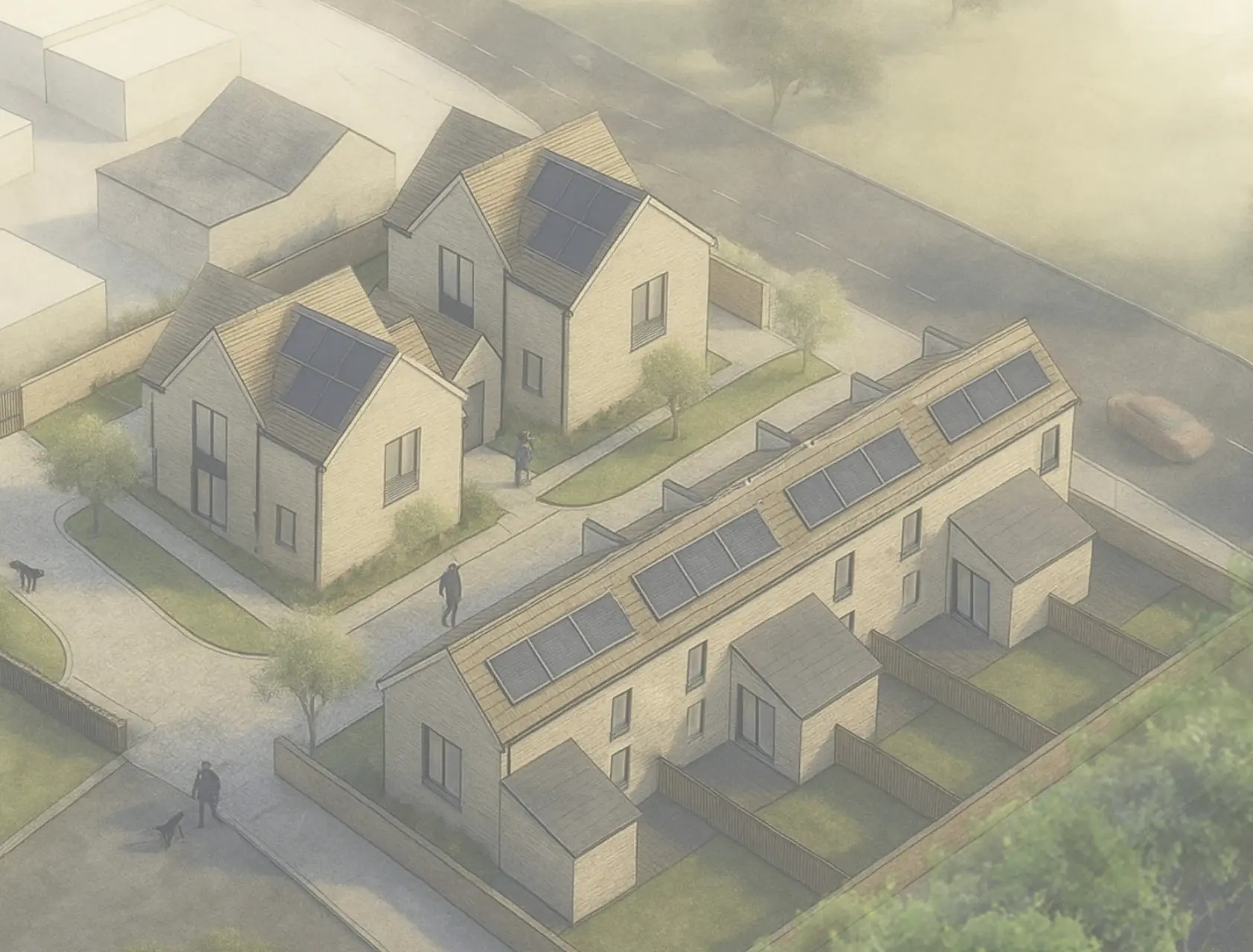 The demolition of the existing residential building and garages, and the development of 9-unit residential houses of varying archetypes for private sale, affordable rent, and intermediate tenure. The remainder of the site will incorporate public access, parking and green areas.